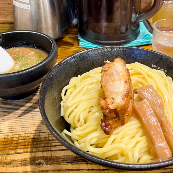 「つけ麺」の麺はストレートの太麺、つけ汁は、鶏と豚が8:2の割合のスープをベースに魚介を合わせている。具材として大きめの炙りチャーシューがのる。