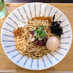 | 備考 | 汁なし麺専門店 Mendesign 跡地 店主はソラノイロ ARTISAN NOODLES、KaneKitchen Noodles のWビブグルマンの名店出身。 「しょうゆらぁめん」のスープは 地鶏ベースでそこに豚の背ガラ、 牛骨をサブで加えた動物系に魚介のWスープ。 (昆布、煮干し、鰹節、鯖節、ムール貝など) 醤油は店主の地元である 福井の山元菊丸商店『ヤマギク醤油』を使用。 1年以上熟成させた天然もろみと 福井の清らかな水で作られた無添加の醤油。 他に3種類の醤油やみりんを加えた醤油ダレ。 塩には蛤などを使ったタレ。 麺は全粒粉入り中細ストレート、三河屋製麺製。 特製トッピングは、4種類のチャーシュー。 (鴨、鶏、豚バラ、豚肩ロース) 米は山の麓の清らかな水で育った 農家直送の福井県産コシヒカリを使用。 ※以上はたかのちゅめ公式ツイッター &「大崎裕史の今日の一杯」より。 |