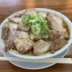 自家製の平打ち麺を山盛りで盛り、チャーシューをズシッと重ね、さらにスープをなみなみ注いだ写真そのものが “腹パン確定演出”で笑った。