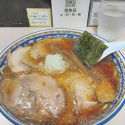 | 備考 | 注文時に麺の硬さを聞かれる(硬め、やや硬め、普通、やや柔らかめ、軟らかめ)。 玉ねぎ多めも無料で対応してもらえる。 チャーシューメンは並、大、特大、超特によってチャーシューの量が異なります。 麺は尾張屋(滝井製麺所製) カウンター上には黒(白)胡椒(ギャバン)、酢、豆板醤、おろしニンニク。 |