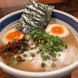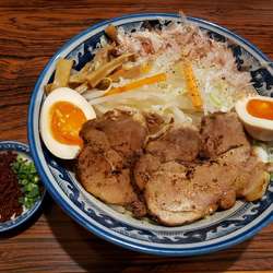こんな時期でなければ食べないであろう「濃厚エビ辛しみそ中華そば」を注文、出来上がるとエビ辛しは別皿で先提供、ラーメンはドーンとデカチャーシューが乗った一杯。