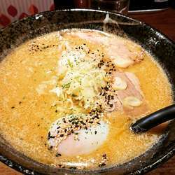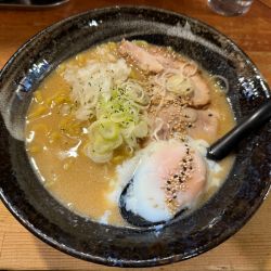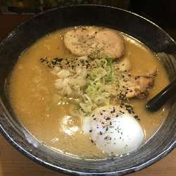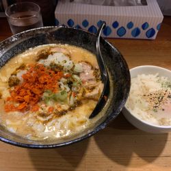 味噌ベースの濃厚スープにカレーとチーズがミスマッチなわけはない。縮れ麺にコクスープが絡み合い美味。揚げ人参やチャーシューも良き。〆リゾットは至福。