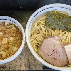 コシ強めの滑らかな丸中太麺は、好みド真ん中で激ウマ🌟 つけ汁は油やや多めのショッパー仕様で、素材が何か認識できない複雑な味わい。麺との調和も素晴らしい。焼豚はブロック状で美味。終盤に自家製辛みで辛さブースト。