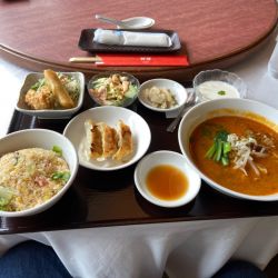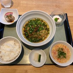 今までの中でNo1と思っていた階杉の汁なし坦々麺とほぼ同じ味。違いは辛さが選べないことと中太平打ち麺。めちゃ旨い。他にスープ、ライス、煮凝り、お新香、デザート付き。